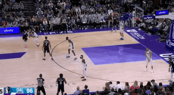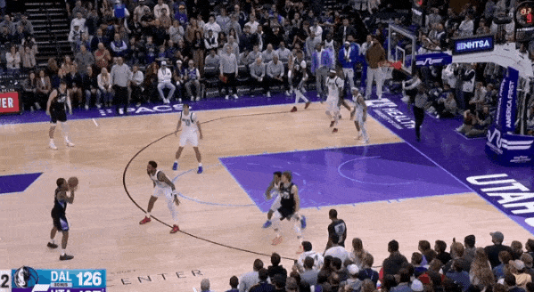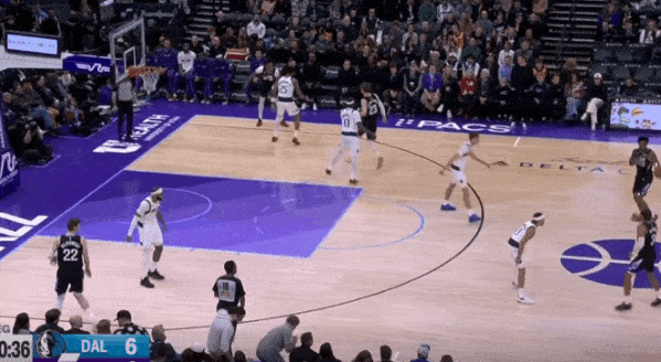 早期进攻为贝利设置“下掩护”(Pin Down),贝利接球后顺势衔接突破吸引两人防守,随后回给后拆至底角的马卡。