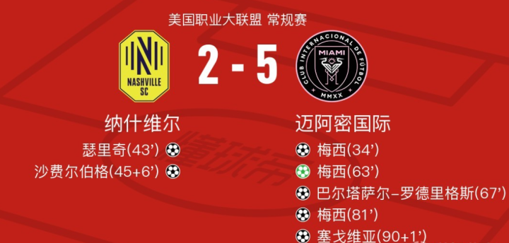 这场比赛上半场,梅西率先破门,但在半场结束前,主队2球反超,好在下半场梅西神勇发挥,又上演两传一射,最终帮助迈阿密5-2大胜,梅西也以帽戏+助攻+满分10分+全场最佳,在联赛上完美收官。