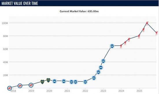 直播吧12月10日讯德转昨日更新英超球员身价,利物浦中场麦卡利斯特身价半年间从1亿欧跌至8500万。