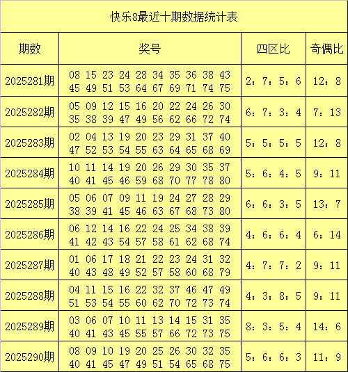 快乐8第2025290期开出奖号:08 09 10 19 20 25 26 30 32 35 40 41 45 47 49 51 54 65 68 75,其中奖号和值为749,跨度为67,012路比为6:5:9,四区比为5:6:6:3,奇偶比为11:9。